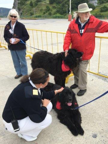 On the dock a pair of the symbolic dogs! Jan became sentimental for Lulu, the Newfie she owned when we first met …