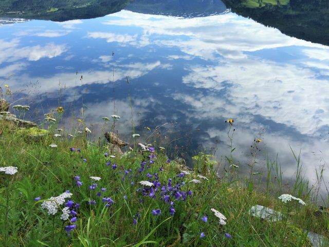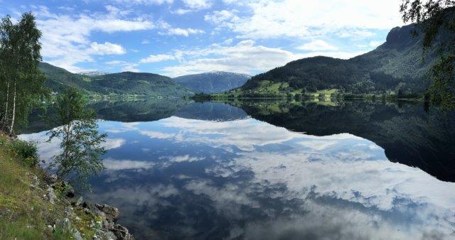 We drove a long loop to Grandvin where a lake feeds down to the fjord. This was our only short break of sunshine … and there was not a breath of wind …